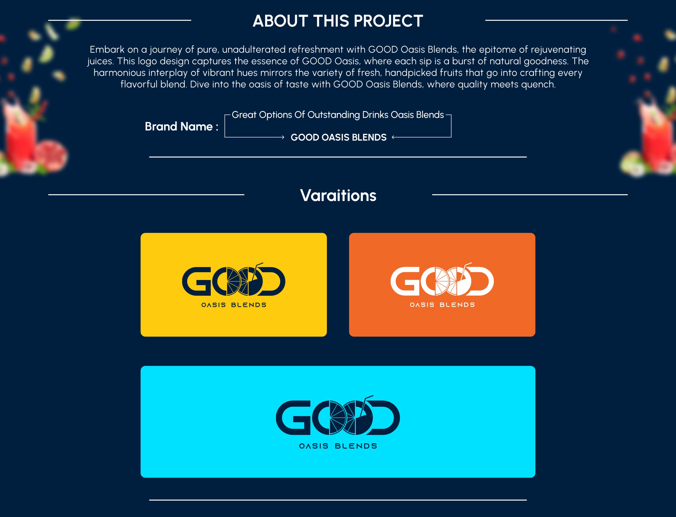 Embark on a journey of pure, unadulterated refreshment with GOOD Oasis Blends, the epitome of rejuvenating juices. This logo design captures the essence of GOOD Oasis, where each sip is a burst of natural goodness. The harmonious interplay of vibrant hues mirrors the variety of fresh, handpicked fruits that go into crafting every flavorful blend. Dive into the oasis of taste with GOOD Oasis Blends, where quality meets quench.